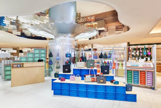会場に足を踏み入れると、ブランドのデザイン言語を象徴するダイナミックな建築と温かみのあるデザインが調和した空間が広がります。空間の中心を照らすランドマークのようなモジュールウォールには、軽やかなライフスタイルを叶えるようデザインされた” BTV-TO-GO ”コレクションをラインナップ。店内の曲線に沿って配されたステンレス製のストーリ―ウォールには、コレクションの進化に合わせて動くトラックディスプレイや印象的なロゴが並び、ミントやブルーをアクセントカラーにしたオリジナルクレートがリズムを添えます。