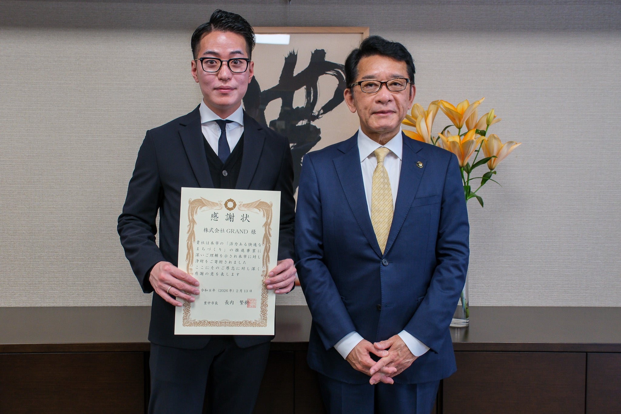 株式会社GRAND代表取締役社長・山元様(左)、長内市長(右)