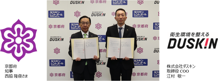 今回締結した本協定は、災害や大規模事故等が発生した際、市町村が運営する避難所等における衛生環境整備を京都府が支援するにあたり、全国にあるダスキンが保有するレンタル資機材や衛生サービスを活用することで、被災者の命と健康を守ることを目的としたものです。