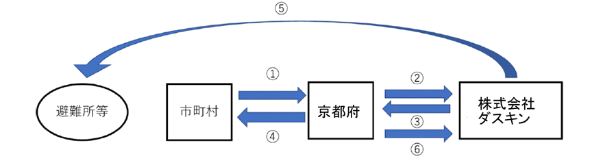 災害時等において、市町村が運営する避難所等の衛生環境整備を京都府が支援するため、株式会社ダスキンが提供するレンタル資機材および衛生サービスを活用し、被災者の命と健康を守る。