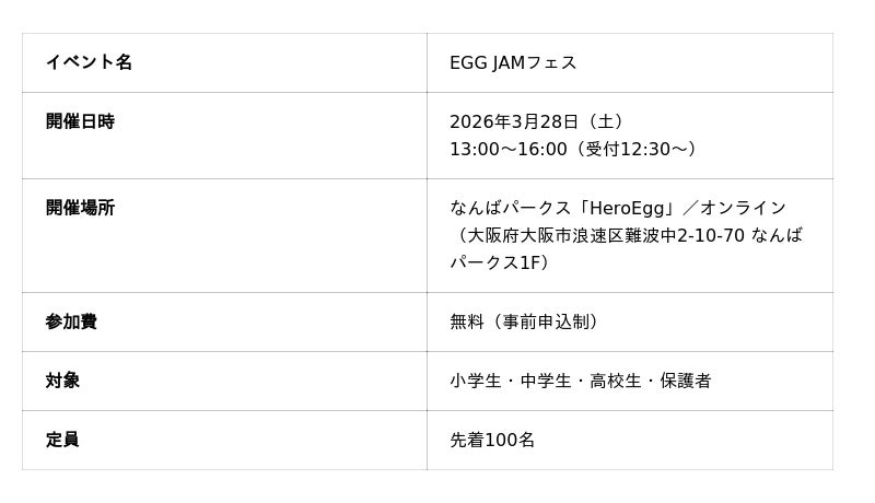 株式会社Meta Heroes(本社所在地:大阪府大阪市、代表取締役:松石和俊、以下「当社」)は、2026年3月28日(土)、なんばパークス内「HeroEgg」およびオンラインにて、AIを楽しく体験できるイベント「EGG JAMフェス」を開催いたします。