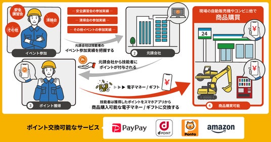 「ビルダーズポイント」は、元請会社が技能者にポイントを付与し、日々の評価や感謝を“見える形”で表現するサービスです。元請会社は独自のポイントプログラムを簡便に構築でき、安全講習会への参加やヒヤリハット報告など安全・改善活動への取り組みに応じて技能者へポイントを付与できます。ポイントの管理・授受は専用アプリ上で簡単に操作可能で、技能者は受け取ったポイントを、PayPayマネーライト(※1)、dポイント(※2)、Pontaポイント コード(※3)、Amazonギフトカード(※4)の4種類の交換先の中から選んで交換でき、提携サービスや加盟店での支払い・商品購入などに利用できます。