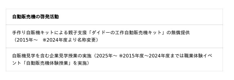 あわせて、自動販売機を通じた取り組みとして、「ダイドーの工作自動販売機キット」の提供など、従来からの活動も継続して展開していく予定です。
