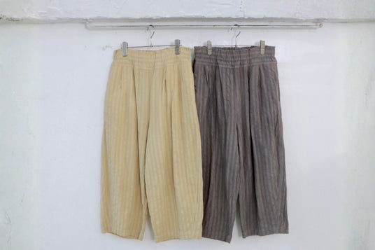 チャイ染めパンツやわらかく落ち感のある風合いは、肌に心地よくなじみ、リラックス感のある穿き心地に。程よくゆとりを持たせたシルエットは、体のラインを拾いすぎず、すっきりとした印象に仕上げています。足首がのぞく軽やかな丈感は、トップスやシューズを選ばず、季節をまたいで活躍してくれます。