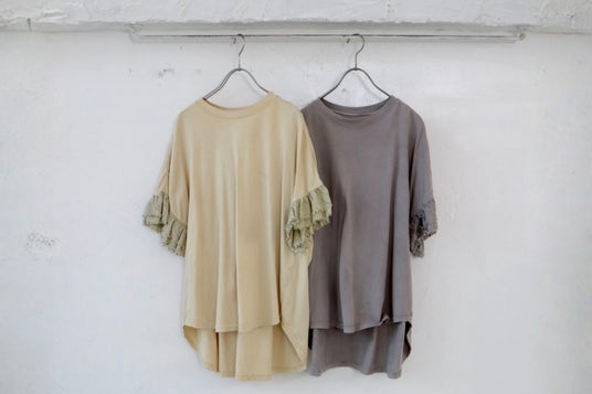 チャイ染めフリルスリーブカットソー軽やかなフリルスリーブが印象的。動くたびにやわらかく揺れ、シンプルな中にさりげない華やかさをプラスします。ゆとりのあるシルエットでリラックス感がありながらも、前後差のある着丈が全体をすっきりと見せ、バランスよく着こなしていただけます。