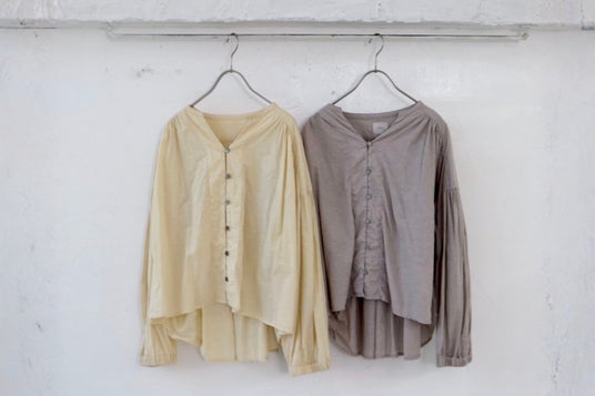 チャイ染め染めブラウスたっぷりと施されたギャザーがやわらかな陰影を生み、ふんわりとした立体感のあるシルエットに。身体のラインを包み込むようなゆとりのあるデザインは、リラックスした着心地でありながら、どこか上品な印象も感じさせてくれます。軽やかな素材感が動くたびにやさしく揺れ、日常のスタイリングにさりげない華やかさをプラスします。